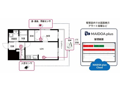 「高齢者見守りサービス」は、センサー機器からクラウド、データ活用までワンストップでIoT導入をトータルでサポートする、IoTプラットフォーム「MAIDOA Plus」を活用し、居室内に設置された温湿度センサー・人感センサーを連携させ、センサーから取得した情報を「MAIDOA Plus」に集約。複合データとして入居者の生活状況をリアルタイムで見守ります。異常を検知した際には即時に住宅スタッフへアラートを発信し、プライバシーに配慮しながら、安心・安全に寄与する見守りサービスの提供が可能となり、同時に住宅スタッフの負担軽減および業務効率化を実現します。