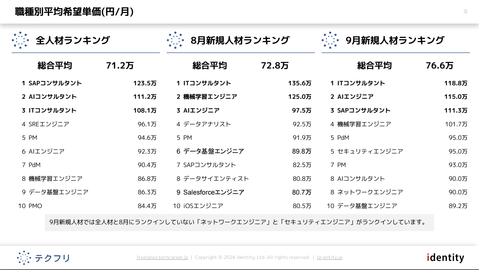 9月新規人材では全人材と8月にランクインしていない「ネットワークエンジニア」と「セキュリティエンジニア」がランクインしています。