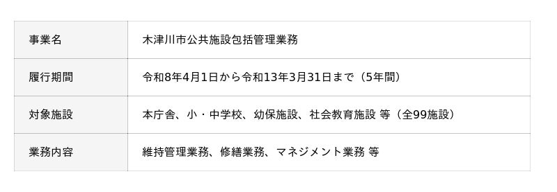 今回公募が行われた「木津川市公共施設包括管理業務委託」では、8者の応募があり、審査の結果、日本管財株式会社が評価点882点(1000点満点)を獲得し、優先交渉権者に選定されました。履行期間・対象施設・業務内容は下表の通りです。
