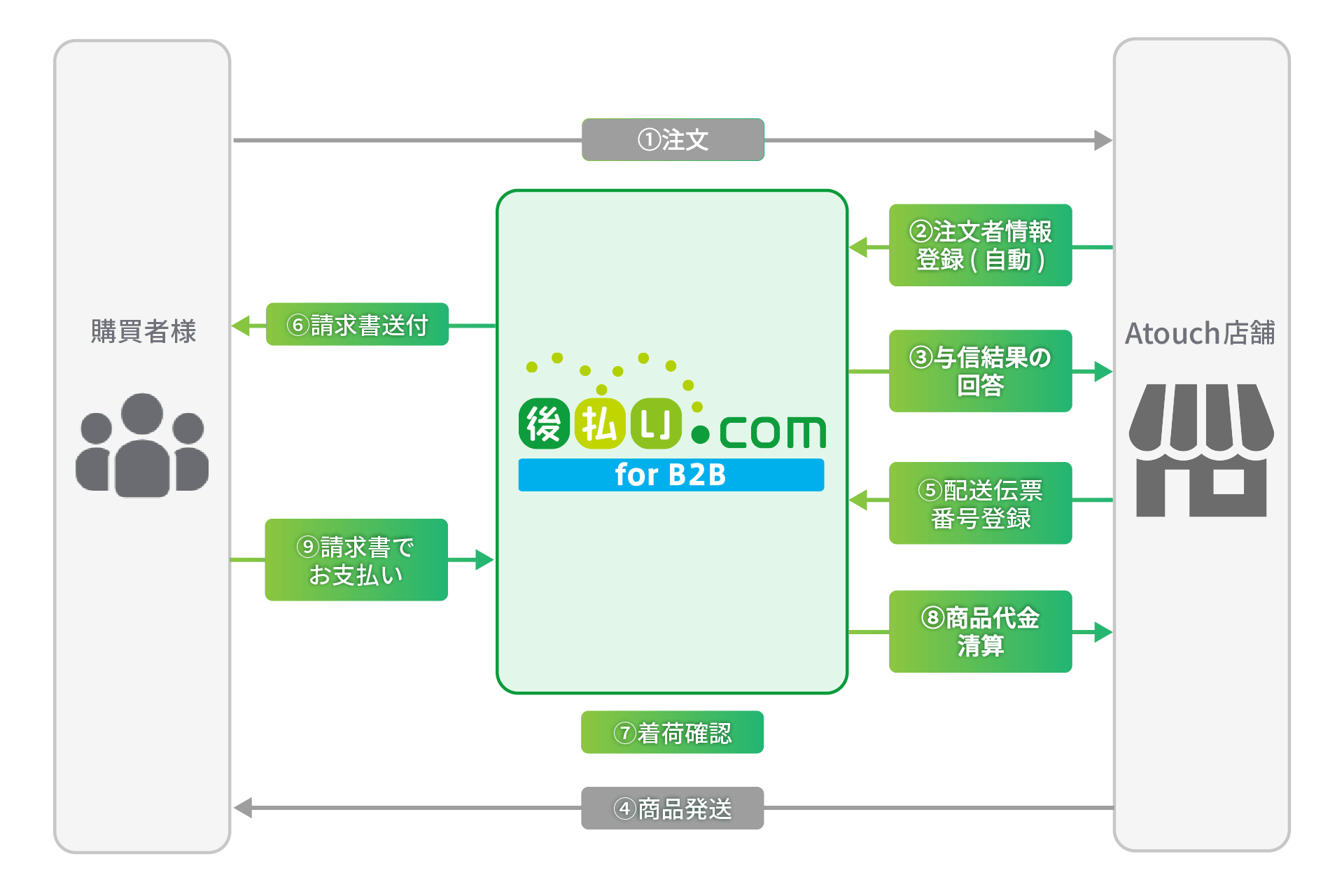 ECサイトやLINEからの注文に対して、商品は先に納品、請求書は月締めで発行され、取引先企業はクレジットカードがなくても購入可能となります。