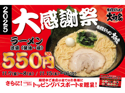 株式会社AZism(本社:東京都八王子市、代表取締役 和田 敏典)が展開する「横浜家系ラーメン大和家」は、日頃のご愛顧への感謝を込めて、2025年11月7日(金)・8日(土)の2日間と2025年11月7日(金)・8日(土)の2日間で「大感謝祭2025」を開催いたします。期間中は、当店人気の「ラーメン(並盛・醤油/塩)」を特別価格