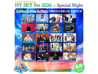 「りゅうせき75th presents HY SKY Fes 2026 & Special Night」が2026年3月20日(金・祝)、21日(土)、22日(日)に沖縄県総合運動公園 多目的広場(沖縄県沖縄市比屋根5-3-1)にて開催されます。このたび、第三弾出演アーティストが発表。チケットはイベントプラットフォーム「TIGET」にて販売中です。
