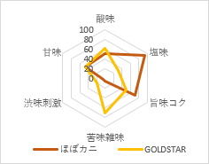 今回の企画では、「ほぼカニ(R)」と「ゴールドスター」それぞれの五味(甘味・酸味・塩味・苦味・旨味)のバランスを分析。その結果、「ほぼカニ(R) × ゴールドスター」は高い相性が確認されました。