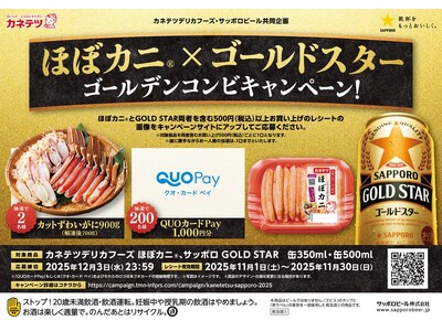 カネテツデリカフーズ株式会社(本社:兵庫県神戸市、代表取締役社長:村上 寛)は、サッポロビール株式会社(本社:東京都渋谷区、代表取締役社長:時松 浩)の「サッポロ GOLD STAR(以下、ゴールドスター)」との共同企画として、ほぼカニ(R) × ゴールドスター 「ゴールデンコンビキャンペーン」を2025年11月1日(土)~2025年12月3日(水)まで実施いたします。