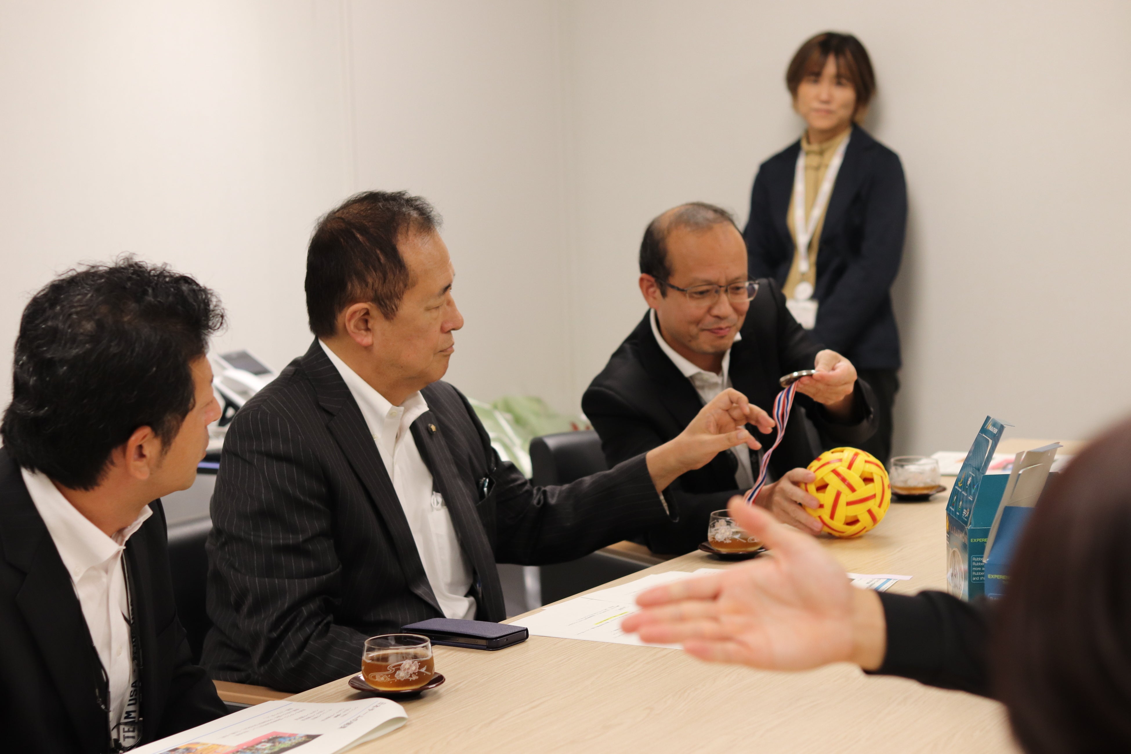 A.S.WAKABAからの報告を受け、歓談の時間に実際の金メダルやセパタクローボールを手に取り、競技について理解を深めた。