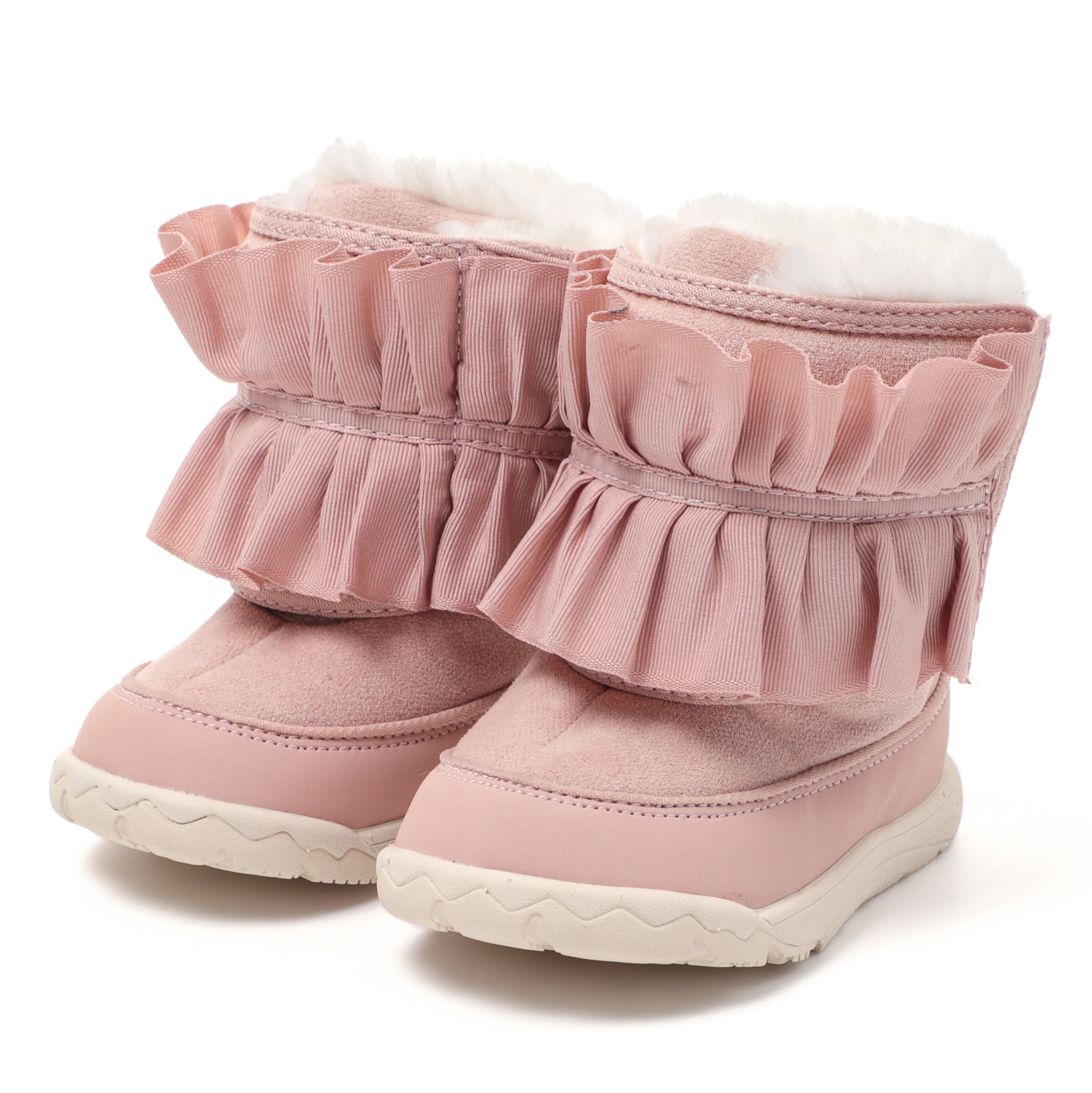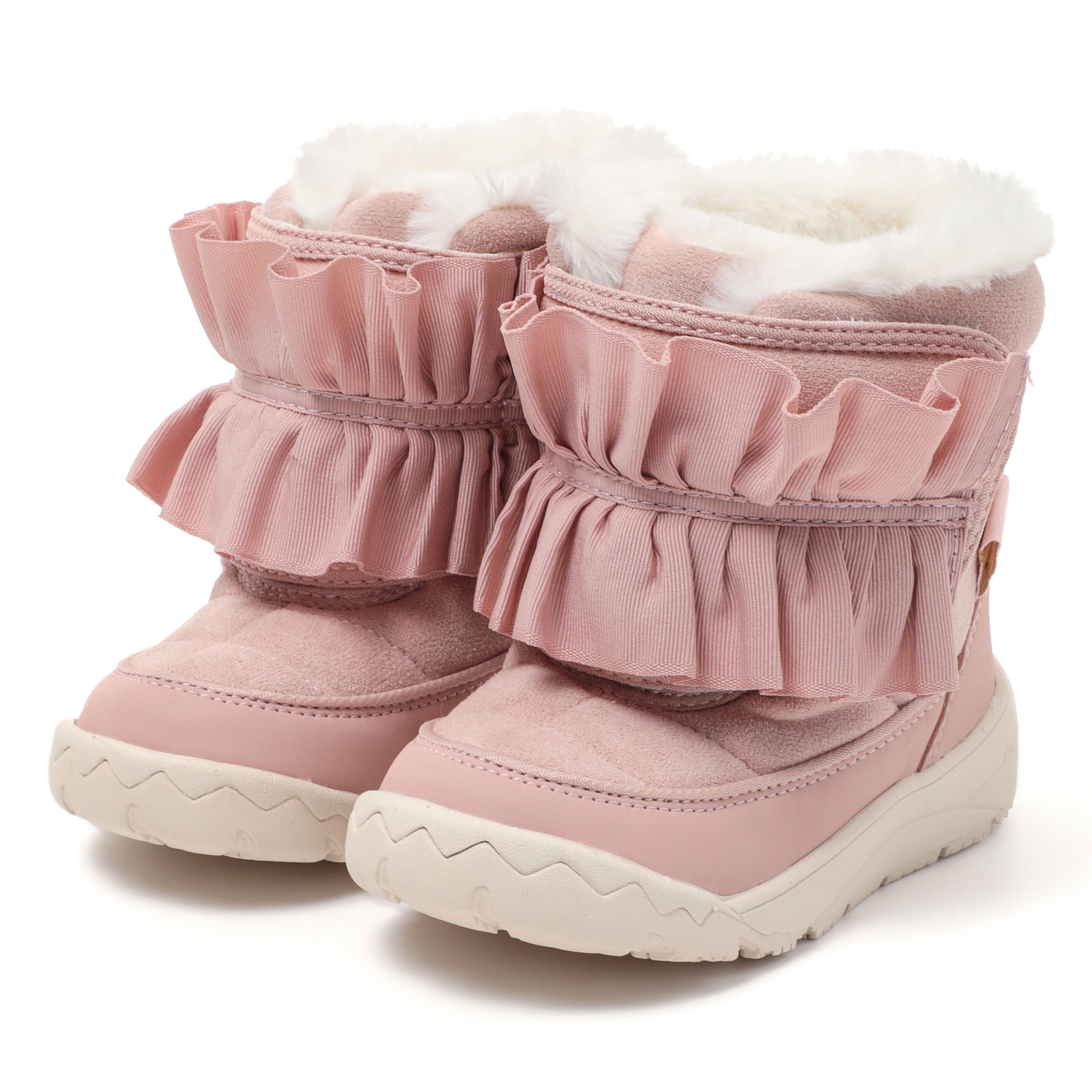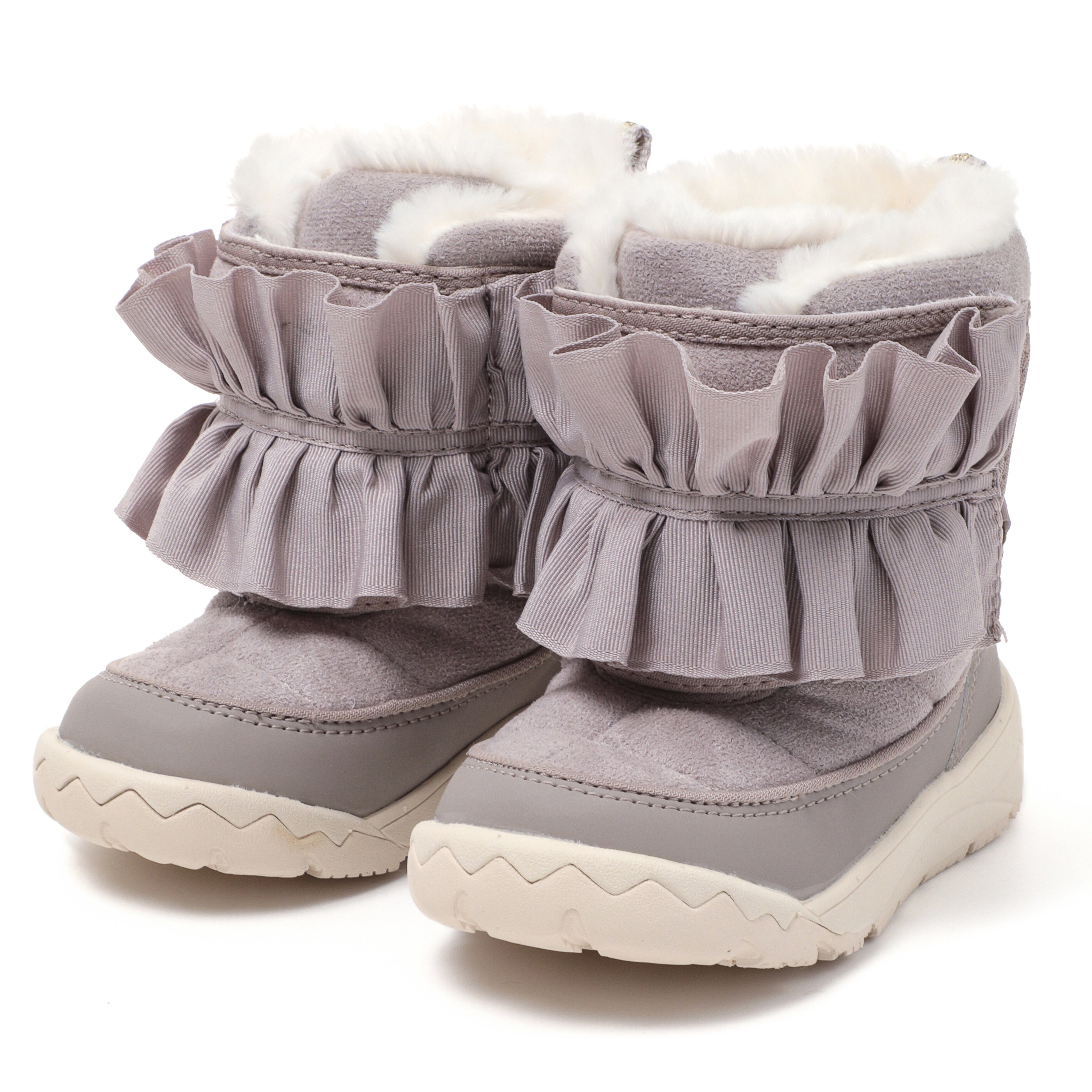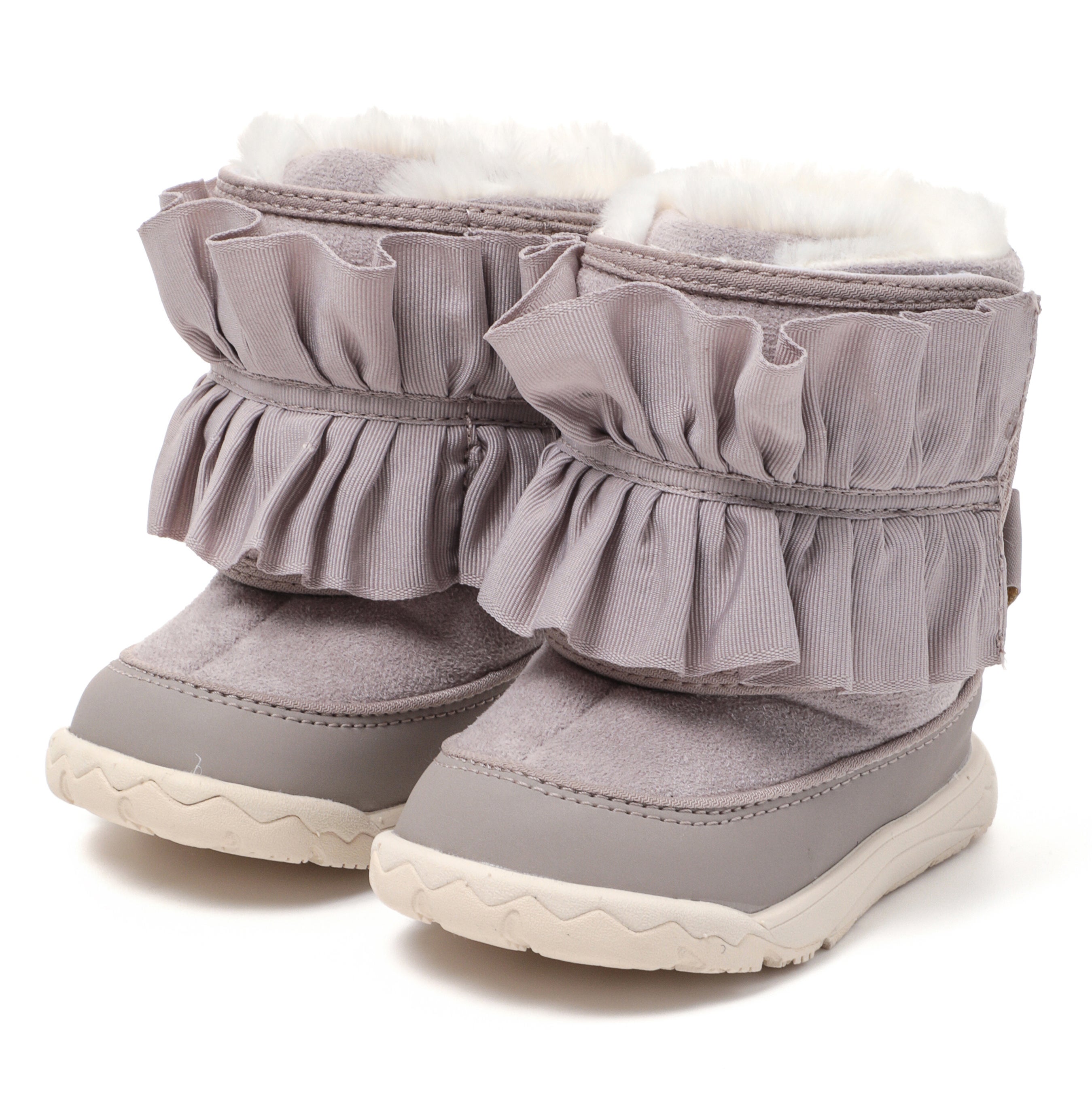 ベルト部分に施したたっぷりのフリルが、とびきりキュートなブーツアイテムです。大きく開く履き口に加え、着脱しやすい一本ベルトタイプの構造のため、お子様ひとりでも簡単に脱ぎ履きできるのも特徴です。シンプルな仕様ながらも、大きなフリルによりガーリーなフォルムにまとめ上げました。スモーキーなカラーリングはお洋服にも合わせやすく、雪の日のお出かけを楽しく彩ります。