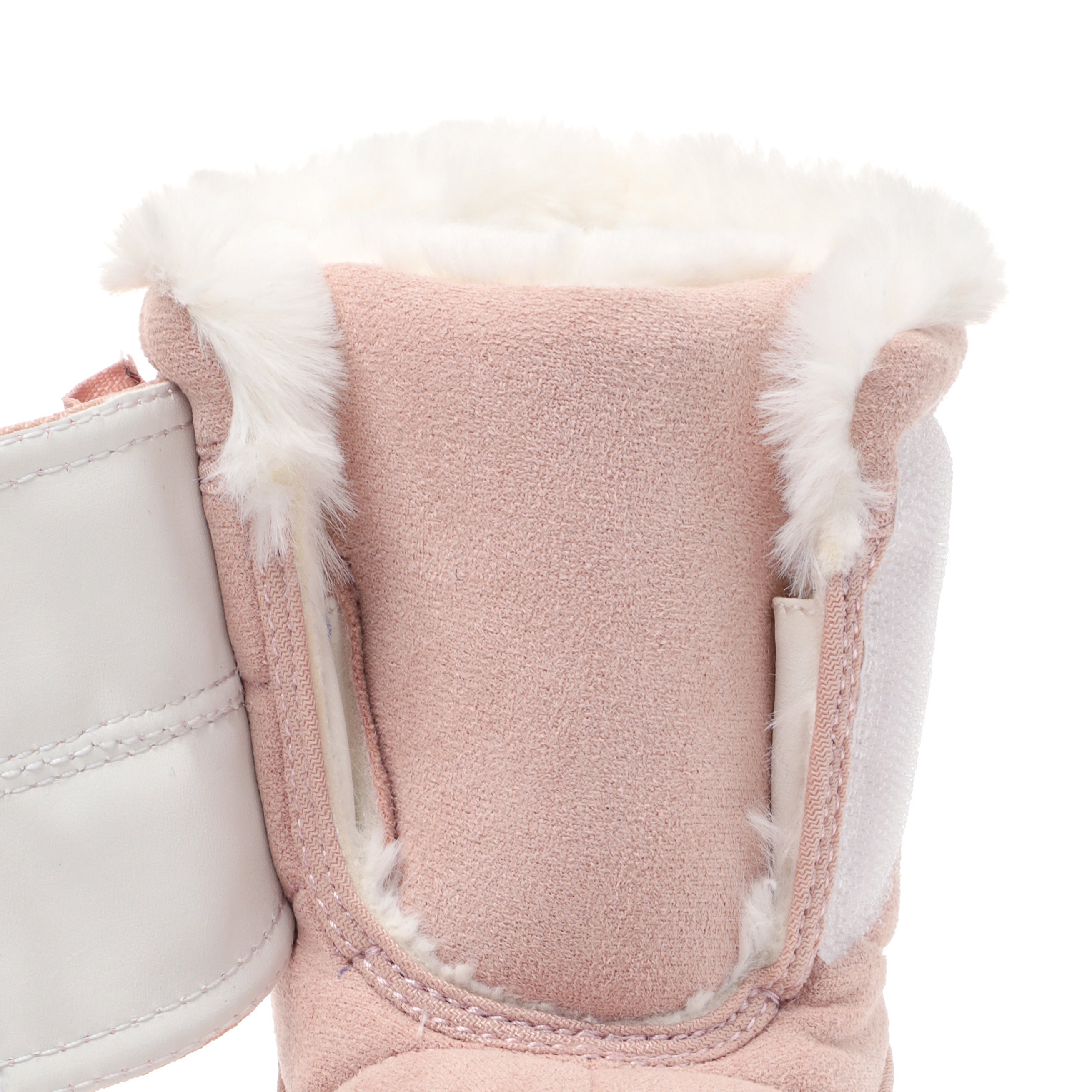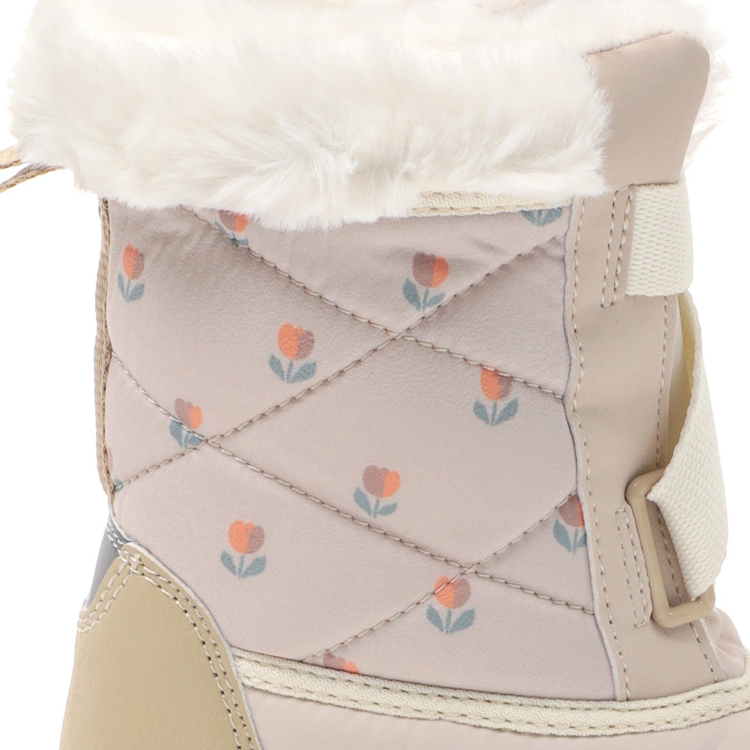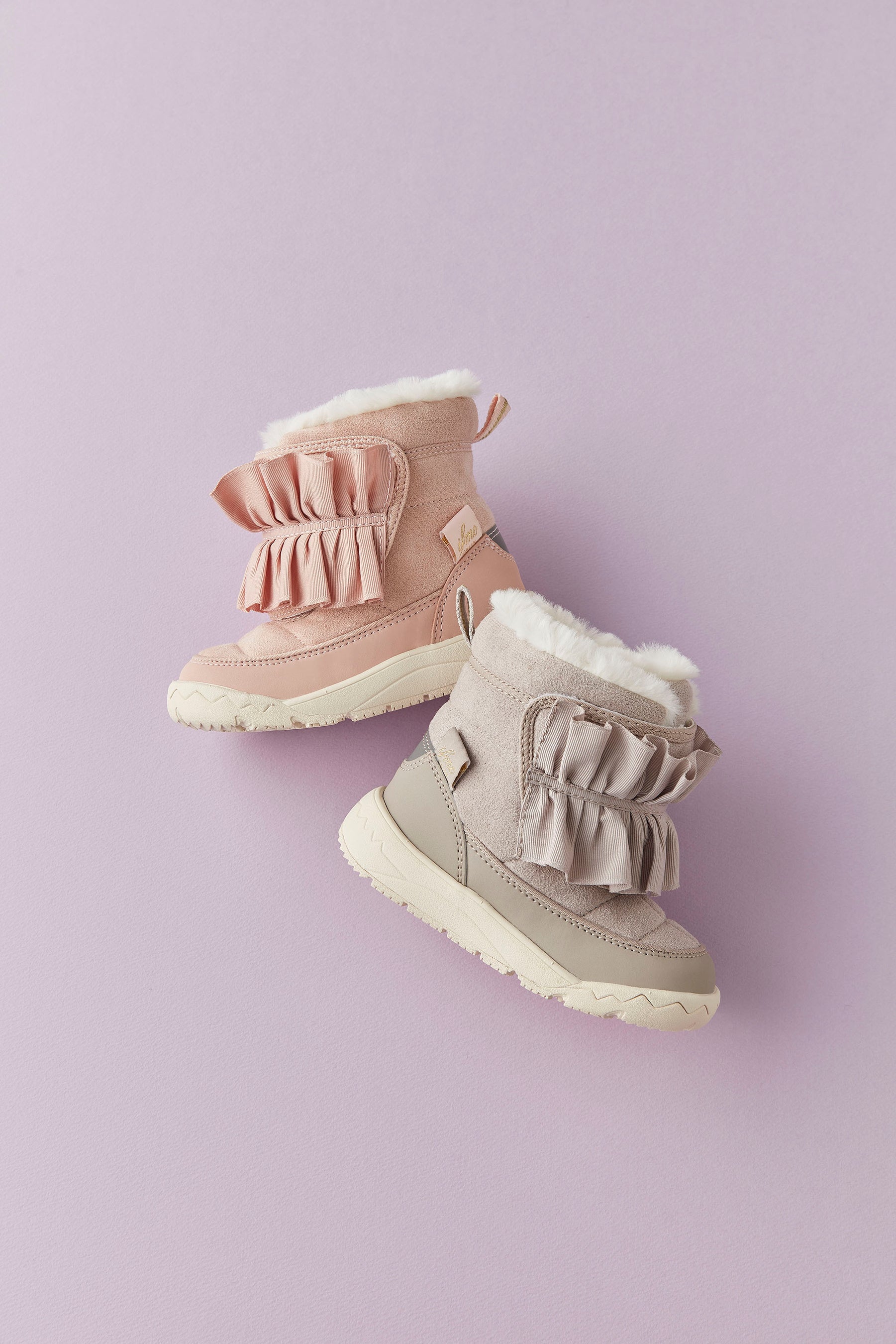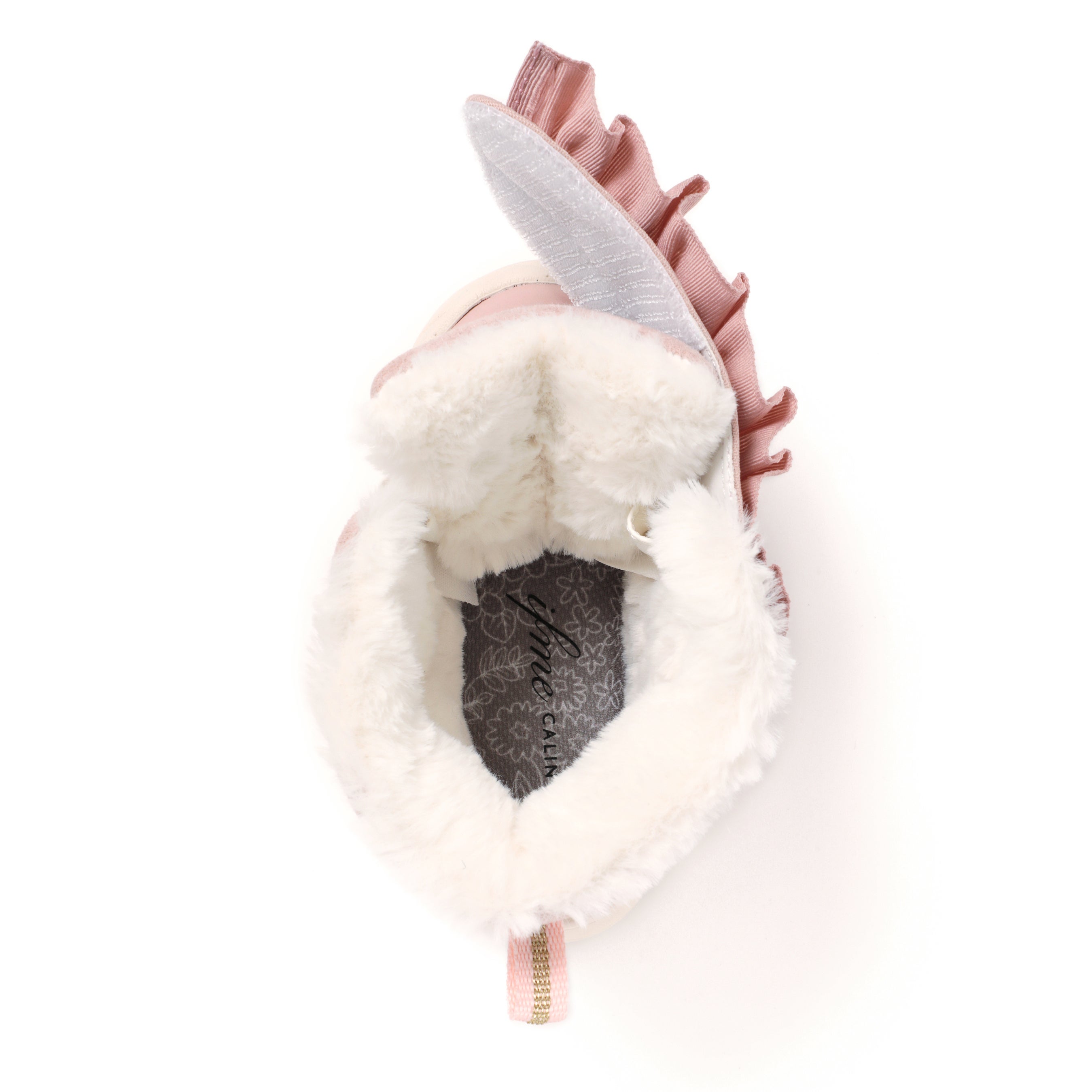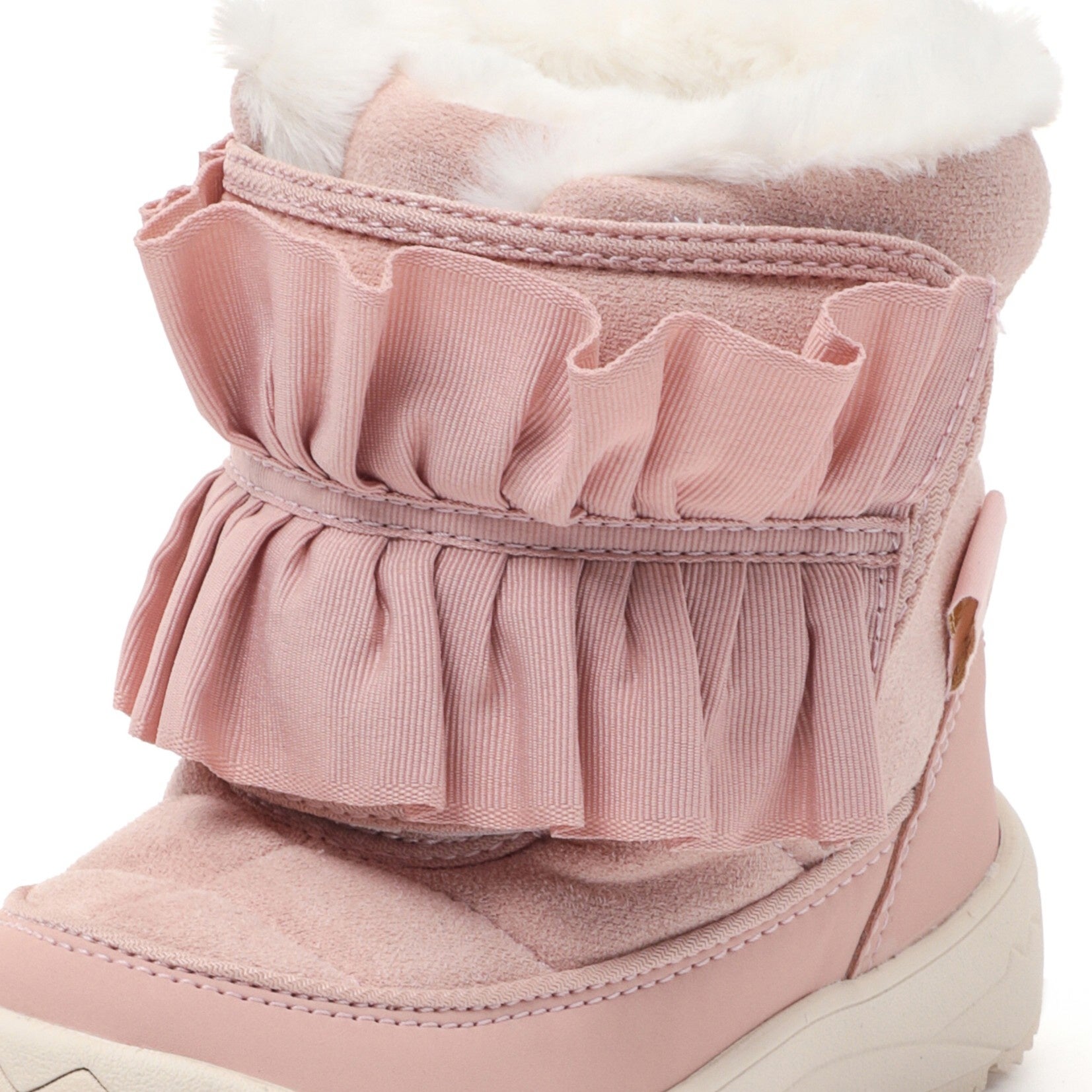ベルト部分に施したたっぷりのフリルが、とびきりキュートなブーツアイテムです。大きく開く履き口に加え、着脱しやすい一本ベルトタイプの構造のため、お子様ひとりでも簡単に脱ぎ履きできるのも特徴です。シンプルな仕様ながらも、大きなフリルによりガーリーなフォルムにまとめ上げました。スモーキーなカラーリングはお洋服にも合わせやすく、雪の日のお出かけを楽しく彩ります。