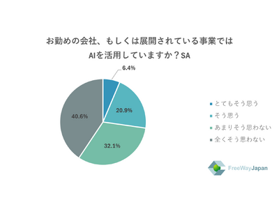 お勤めの会社、もしくは展開されている事業ではAIを活用しているか聞いたところ、「全くそう思わない」が40.6%、「あまりそう思わない」が32.1%、「そう思う」が20.9%、「とてもそう思う」が6.4%という結果だった。