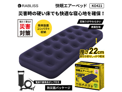 厚さ22cmのエアーベッドが、硬い床や冷えから身体を守ります。電源不要の専用ポンプで素早く膨らみ、すぐに使えます。軽量&コンパクト収納で備蓄や持ち運びに便利なエアーベッドです。