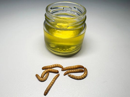 写真:ミルワームと、ミルワームから抽出された油脂(バイオ燃料原料)
