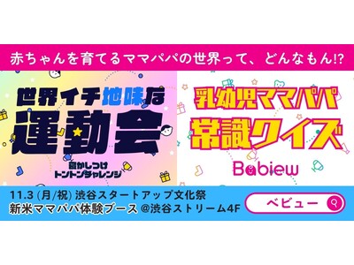 「渋谷スタートアップ文化祭」に「新米ママパパ体験ブース」を出展します。「世界イチ地味な運動会」から「寝かしつけトントン」競技、さらにママパパでない方にこそ挑戦していただきたい「新米ママパパ常識クイズ」をご用意します。