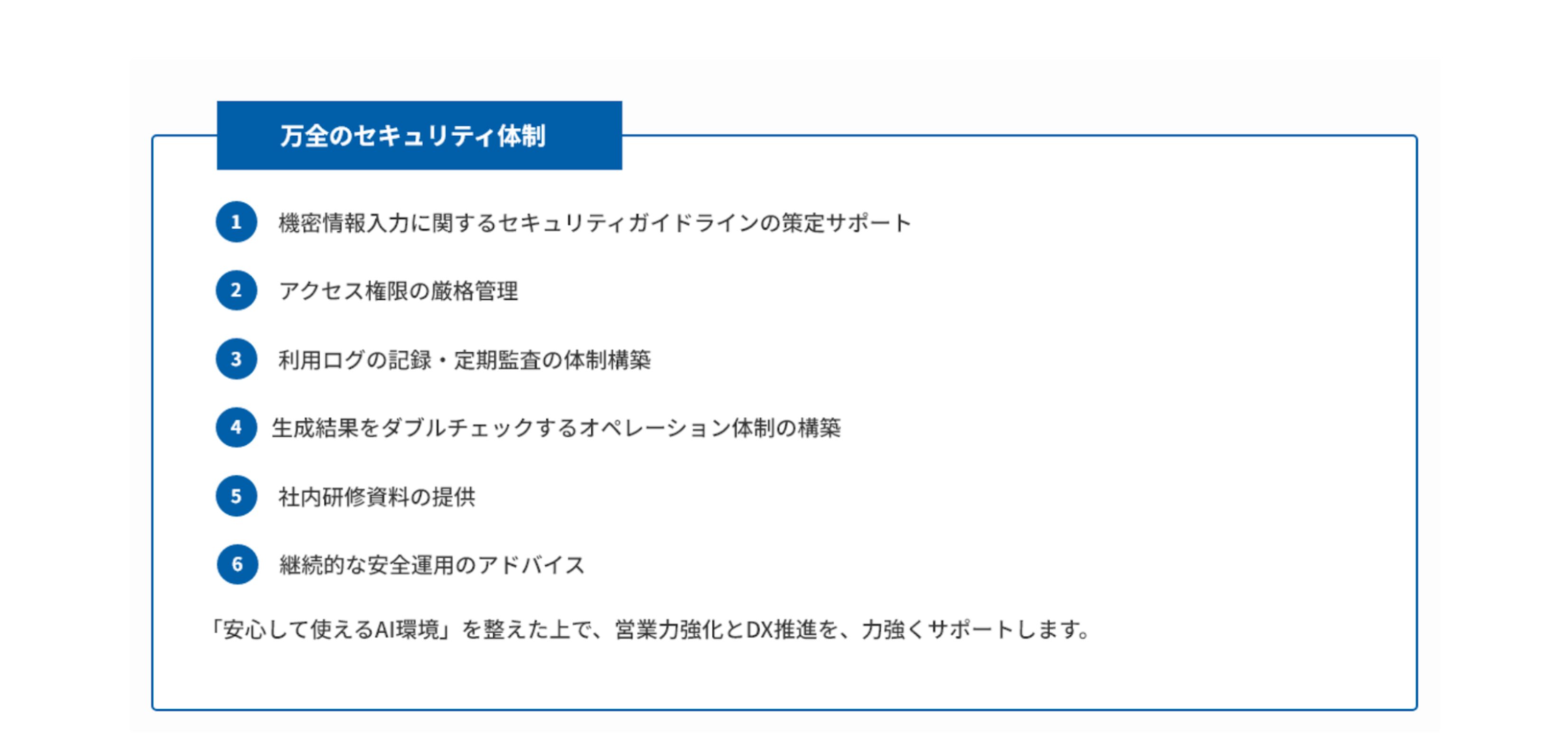営業経験のあるPFS担当チームが、お客様と同じ目線で現場に入り、AIの開発やプロンプトの設計を行います。各社の営業現場のニーズに応じて、20種類以上のAIから最適なAIツールを選定し、現場のニーズに合わせ、適材適所の設計を行います。これにより、これまで培ってきたお客様独自のセールスノウハウを維持しながら、AI業務マニュアルの標準化や社内情報やノウハウの共有体制が構築でき、さらには文書作成にかかる大幅な時間短縮が期待できるなど、営業DXの構築が可能です。