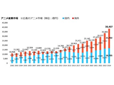 2024年のアニメ産業市場は3兆8,407億円となり、前年比114.8%の増加で、市場最高値を更新。