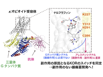 明治大学理工学研究科 光武亜代理准教授、学校法人関西医科大学(大阪府枚方市 理事長・山下敏夫、学長・木梨達雄)医学部医化学講座 清水(小林)拓也教授、寿野良二准教授、名古屋工業大学生命・応用化学類 片山耕大准教授、神取秀樹特別教授、京都大学大学院薬学研究科・東北大学大学院薬学研究科井上飛鳥教授(京都大学/東北大学)、筑波大学国際統合睡眠医科学研究機構 斉藤毅准教授、大阪大学蛋白質研究所 加藤貴之教授らの共同研究グループは、ヒトκオピオイド受容体のバイアスドシグナリング機構を従来より詳細に解析し、新たにシグナル選択性に関与するアミノ酸残基を同定しました。