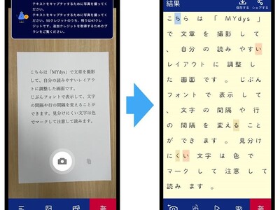 DNPは、ファシリティジャポンが開発した、文字情報の読み取りが困難な人の読字をサポートするアプリ「MYdys」に「じぶんフォント」のライセンスを提供しました。本アプリは、書籍やプリント、看板などを撮影したり、文字が写っている画像ファイルを読み込んだりすると、アプリが自動的に文字を認識し、フォントの種類・文字の大きさ・行間・文字間隔・色などを読みやすく調整します。国内では現在、多様な読み書き特性に対応したフォントが少ないため、フォントの選択肢を増やしたいという課題・ニーズに対応し、今回「じぶんフォント」が採用されました。
