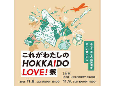 北海道内7空港を運営する北海道エアポート株式会社(本社:北海道千歳市、以下HAP)と7空港所在自治体(10市町:千歳市、苫小牧市、稚内市、釧路市、白糠町、函館市、旭川市、東神楽町、帯広市、大空町)で構成される北海道誘客促進実行委員会(事務局:HAP)は、11月8日(土)~9日(日)の2日間、「これがわたしのHOKKAIDOLOVE!祭 2025」をららぽーとEXPOCITYで開催します。