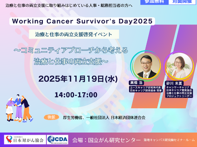 公益財団法人日本対がん協会とNPO法人日本キャリア開発協会(JCDA)は、働く世代のがん患者の治療と仕事の両立支援に関するイベント「Working Cancer Survivor's Day 2025」を、11月19(水)に開催します。