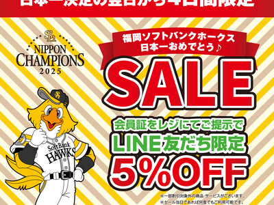 北部九州・山口等に67店舗のホームセンター「グッデイ」を運営する株式会社グッデイ (本社:福岡市中央区 代表:柳瀬隆志) は、福岡ソフトバンクホークスの<SMBC日本シリーズ2025>優勝を記念して、『福岡ソフトバンク 日本一おめでとう♪SALE』をグッデイ全65店舗にて10月31日(金)~3日(月祝)の4日間限定で開催いたします。