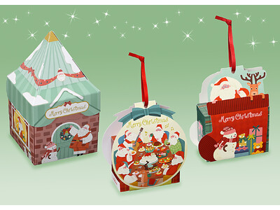 特長:スノードームをイメージしたボックスに、2種のクッキーをアソートしました。正面はサンタさんたちがパーティーをしている様子が、裏面は子どもたちへプレゼントを届けに行くサンタさんとトナカイのデザインが楽しめます。