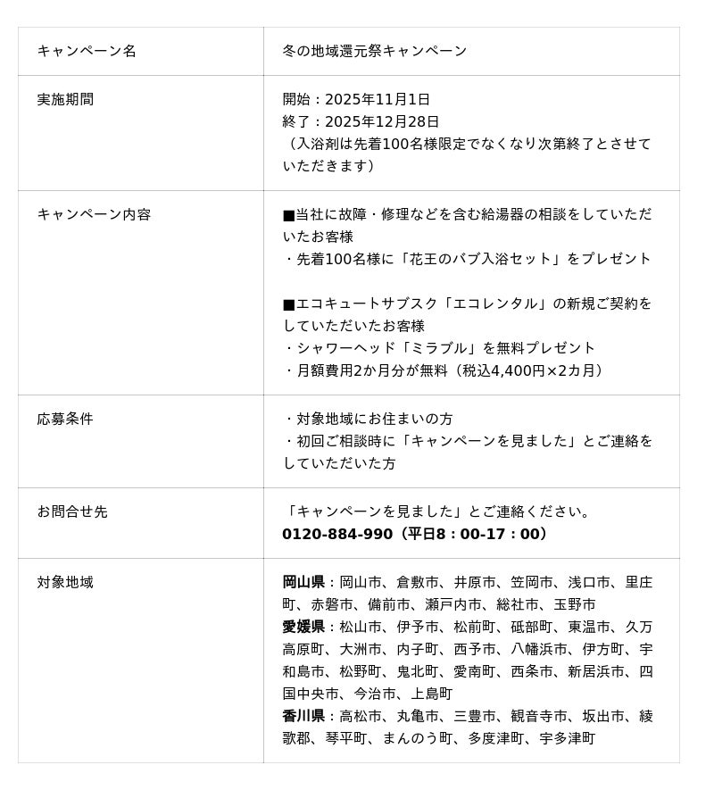 2025年11月1日から同年12月28日まで、当社へ給湯器の相談をしていただいた方を対象に、オトクなキャンペーンをご提供します。また、本期間中にエコキュートサブスク「エコレンタル」をご契約いただいたお客様には、追加特典をご用意させていただきました。詳細は下記のとおりです。