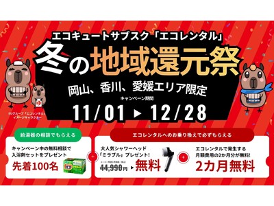 中四国地方でエコキュートのサブスク「エコレンタル」を展開するEUグループ株式会社(本社:岡山県倉敷市、代表:河合 雄治)は、地元のお客様へ感謝の意を込めて、「冬の地域還元祭キャンペーン」を2025年11月1日より開始いたします。本キャンペーンは、当社が運営する給湯器事業を多くのお客様にご利用いただくことを目的としており、2025年12月28日までの期間限定で特別な優待をご用意しております。
