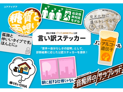 5,000以上の応募作品の中からグランプリに選ばれた「言い訳ステッカー」は、遺伝子検査で苦手な傾向が出た項目をステッカー化することで自己肯定感を高める企画です。たとえば、遺伝的に「朝に弱い」傾向がある人が「朝に起きる仕様じゃない」と記されたステッカーを提供。自分の特性をポジティブに受け入れ、周囲とのコミュニケーションにも活用できるアイデアです。