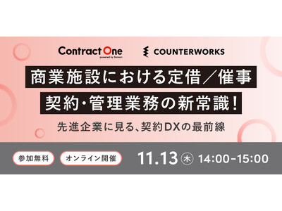 商業施設向けリーシング(※)DXシステム「ショップカウンター エンタープライズ」を提供する株式会社COUNTERWORKS(本社:東京都港区、代表取締役CEO:三瓶 直樹、以下「カウンターワークス」)は、取引管理サービス「Contract One(コントラクトワン)」を提供するSansan株式会社(本社:東京都渋谷区、代表取締役社長/CEO/CPO:寺田 親弘)と共同で、“商業施設の契約・管理業務のDX”をテーマにしたウェビナー「先進企業に見る、契約DXの最前線 ~定借/催事における契約・管理業務の新常識」を、2025年11月13日(木)14:00~15:00に開催いたします。