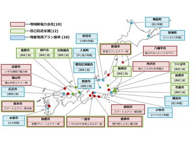 磐田市(スマートエナジー磐田(株))、所沢市((株)ところざわ未来電力)、熊本市(スマートエナジー熊本(株))、福山市(福山未来エナジー(株))、新潟市(新潟スワンエナジー(株))、豊橋市(穂の国とよはし電力(株))、出雲市(いずも縁結び電力(株))、鈴鹿市(鈴鹿グリーンエナジー(株))、一宮市(いちのみや未来エネルギー(株))、八幡平市((株)はちまんたいジオパワー)