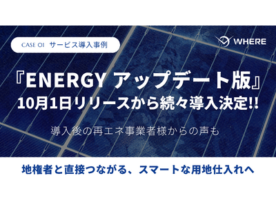 株式会社WHERE(本社:東京都/代表取締役:阿久津 岳生)が提供する不動産AIツール『WHERE』の新機能群「ENERGYアップデート版」について、10月1日のリリース以後、再生可能エネルギーやインフラ開発を手がける複数の企業で導入されました。