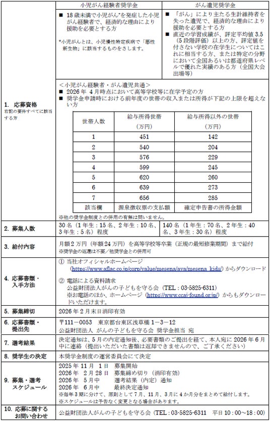 アフラック生命保険株式会社(代表取締役社長:古出 眞敏)は、「アフラック小児がん経験者・がん遺児奨学金制度」における2026年度の新規奨学生を、2025年11月1日から2026年2月28日まで募集します。