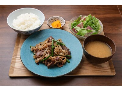 期間限定ランチメニュー「岩国れんこんと高森和牛のスタミナ炒め(岩国市産マイヤーレモンドレッシングのサラダ、ご飯、味噌汁、漬物付き)」 提供イメージ写真