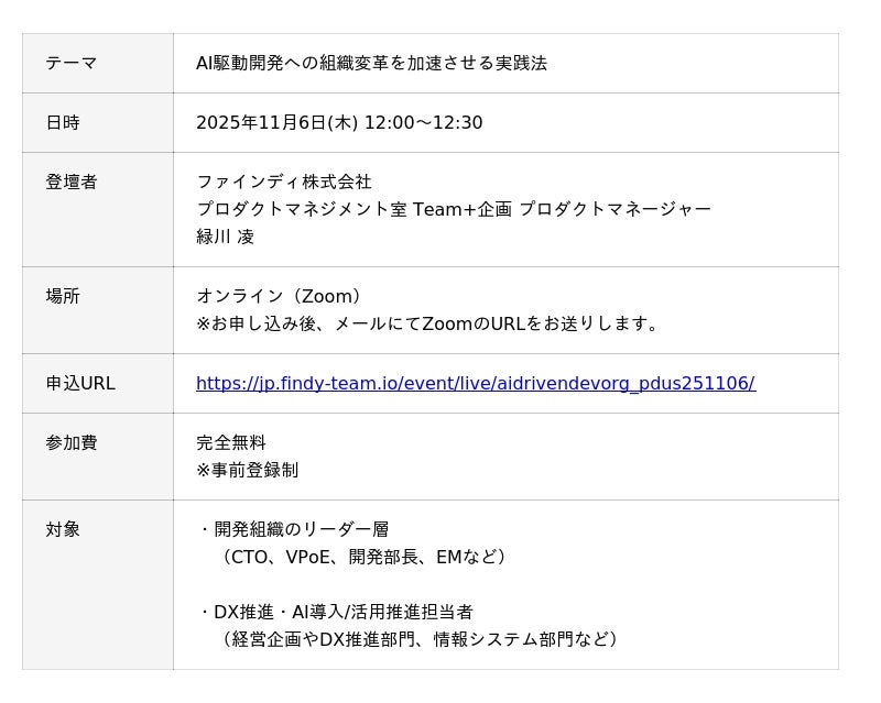 新機能のリリースにあわせて、オンラインセミナー「AI駆動開発への組織変革を加速させる実践法」 を、11月6日(木)12:00~12:30に開催いたします。本セミナーでは、AI活用の成果を「数値」で可視化し、AI駆動開発に向けた組織変革を加速させる実践手法をご紹介します。
