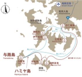 与路島は、鹿児島県大島郡に立地する奄美大島の行政単位の中で人口の最も少ない有人離島(人口44名)です。島の住居の約7割が珊瑚石垣に囲まれ、一夜花のサガリバナが有名で、近くには無人島のハミヤ島もあります。