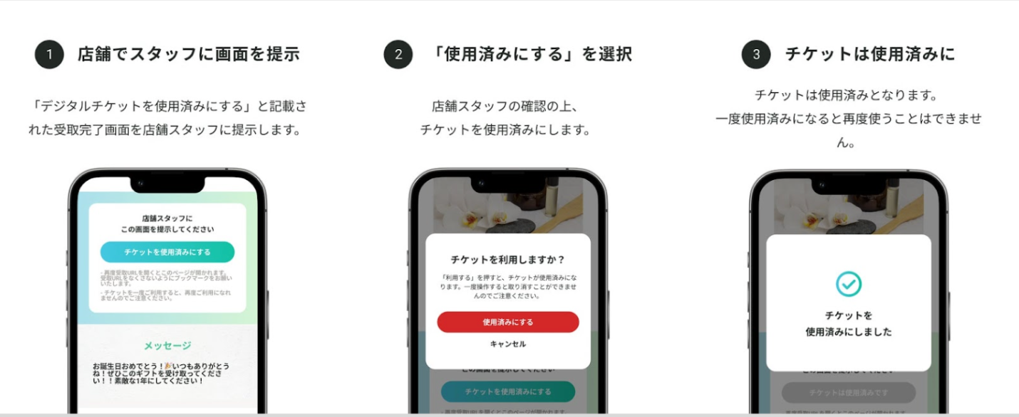 ギフトを受け取った方は店舗でデジタルチケットを利用する際に、店舗スタッフにスマートフォンでeギフトの受け取り完了画面を提示します。スマートフォンの画面でスタッフにより「チケットを使用済みにする」とするだけで簡単にチケットをご利用いただくことが可能です。
