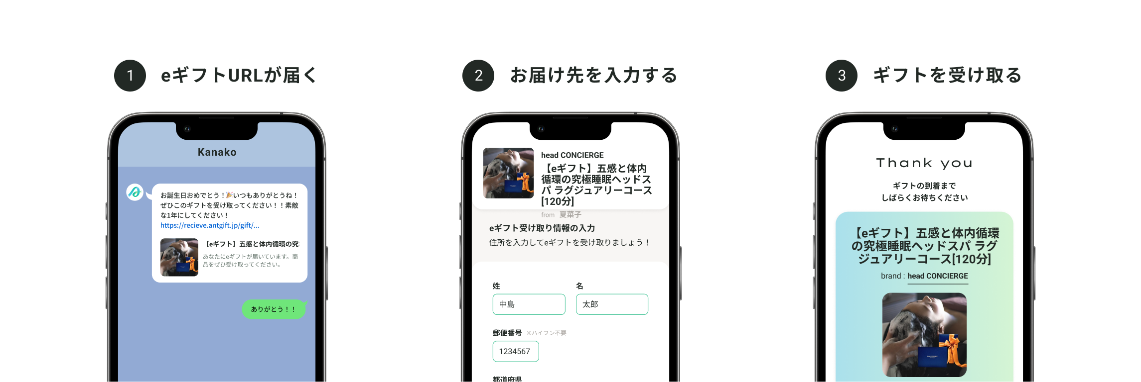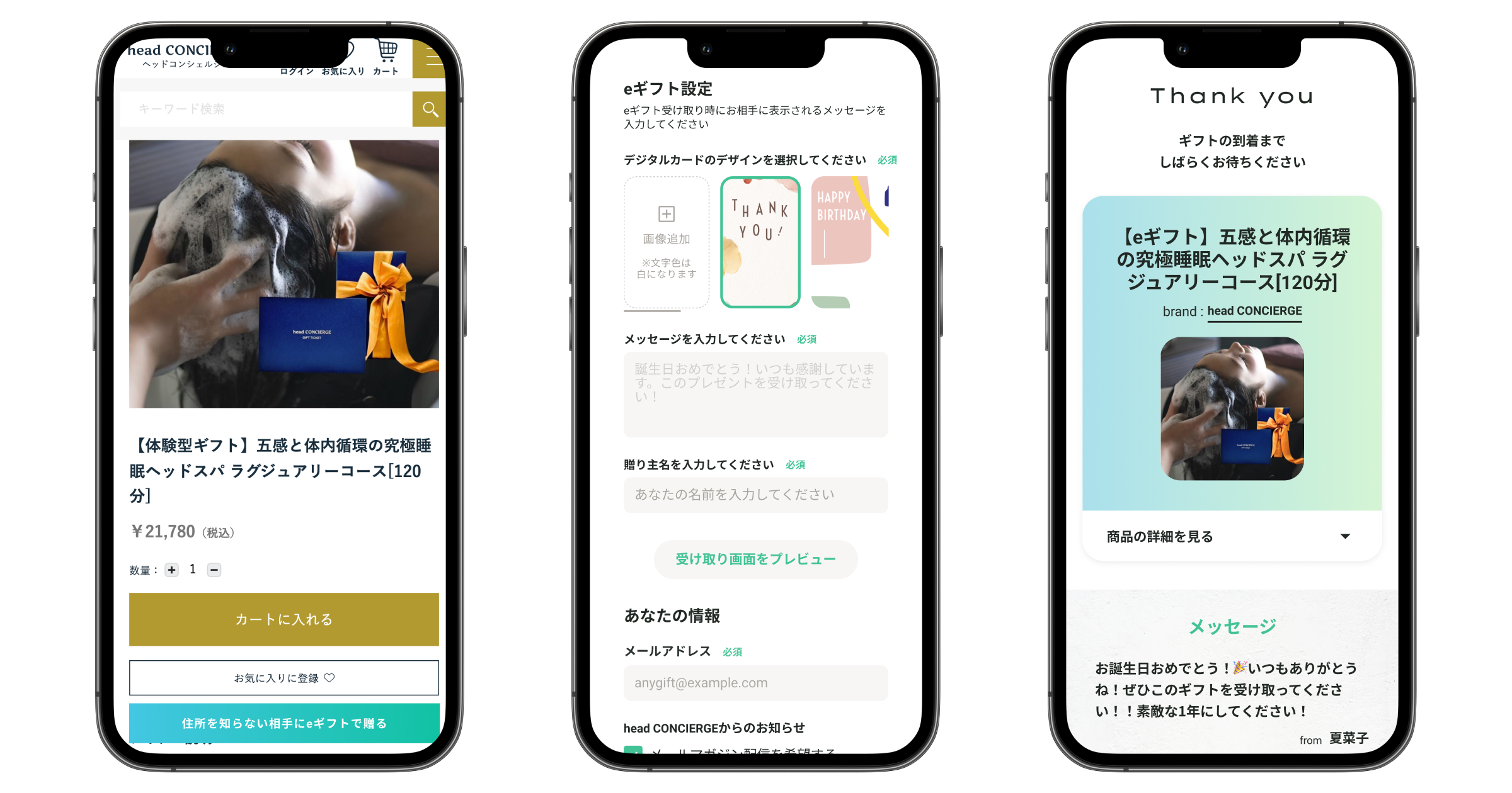 いつもお世話になっている方へのちょっとした贈り物や、ヘッドスパや癒しが好きな方への誕生日・記念日・サプライズをしたいときなど、相手の住所を知らなくても気軽に「ヘッドコンシェルジュ」の店舗でご利用いただけるデジタルチケットをeギフトとして贈ることが可能です。URLはご注文後すぐに発行されるので、すぐに贈ることができます。
