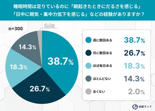 「週に数回ある」(38.7%)、「ほぼ毎日ある」(18.3%)と回答した人を合わせると、57.0%が“眠れているのに眠い”状態を経験している結果に。睡眠の“量”よりも“質”に問題がある可能性を示唆している。