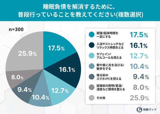 睡眠負債解消法の最多は「就寝・起床時間を一定にする」(17.5%)→ 生活リズムを整える“基本の改善策”が最も実践されており、規則正しい睡眠習慣の重要性が認識されている。