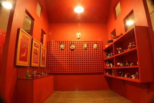 布袋状の胴体に木製の顔と手足が取り付けられています。人形師が手を入れて操ることから「掌中戯(手のひらの劇)」とも呼ばれます。