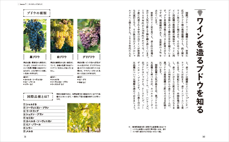 ワインが好きで、ワインをもっと知りたい、ワインをもっと学びたい人のための中級者向けワインガイド。ワインの資格試験を視野に入れている方に加え、教養としてのワインの蘊蓄をもっと読みたい方々にも納得いただける一冊。長年ワインスクールで教えてきた著者のノウハウを惜しげもなく披露。さらに、ありふれた初心者向けの話ではなく、この著者ならではの一歩進んだ蘊蓄を深く語っていきます。具体的には、有名品種だけではなく、黒ブドウ、白ブドウ、合わせて59種類をしっかり紹介。また、著者の経験に基づくテイスティングロジックをわかりやすい図版とともに紹介していきます。本書にしかない情報も数多く得られます。