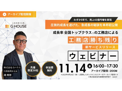 株式会社Gハウス(所在地:大阪府大阪市旭区、代表取締役社長:趙 晃啓)は、2025年11月14日(金)に当社として初となるウェビナーを開催いたします。本ウェビナーでは、現代表の就任からわずか5年で売上43億円増を実現し、全国トップクラスの成長率を達成したその背景と新たに展開するサービスを業界関係者の皆さまに向けて初めて公開いたします。【※工務店様限定】