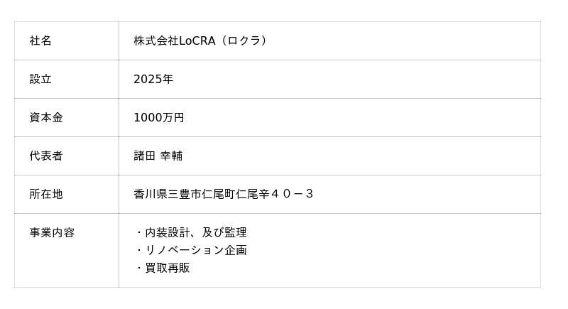 オフィスやクリニックを中心とした空間の内装デザイン・設計・施工を手掛けるユニオンテック株式会社(東京都渋谷区、代表取締役 大川祐介、以下「当社」)は、2025年8月に香川県の空き家を活用した地方創生事業を運営する新会社「株式会社LoCRA(以下、ロクラ)」を設立し、10月より始業しました。ロクラは、深刻化する空き家問題をはじめとした地域課題の解決に、空間デザインの力で挑みます。