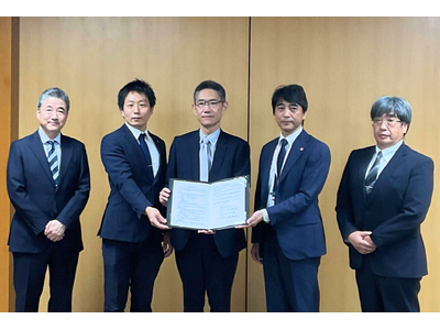左から ホンダトレーディング執行役員 正木 一臣、金田 英樹 大津町長、ホンダトレーディングアルミニウム社長 水口 浩太郎、上田 哲也 熊本県商工労働部長、ホンダトレーディングアルミニウム取締役 木村 之治=24日、県庁(写真ご提供:熊本県)