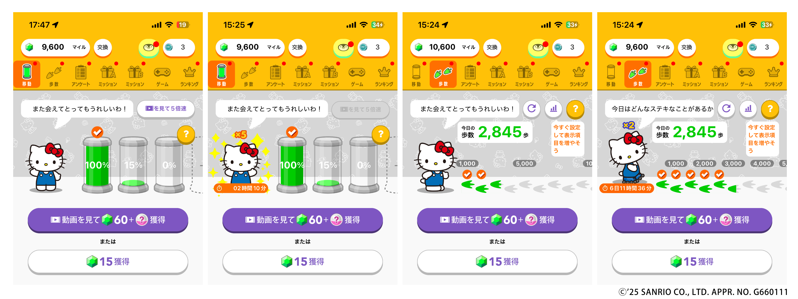 アプリ内の移動画面および歩数画面に表示されるキャラクターを、お好きなサンリオキャラクターズに変更できます。