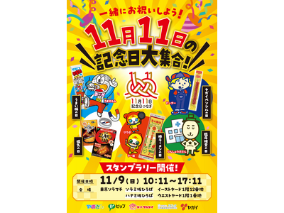 11月11日に記念日を制定するピップ株式会社(本社:大阪市中央区、代表取締役社長:松浦由治)は、同じ日に記念日を制定している、株式会社マルタイ、株式会社やおきん、一般社団法人日本臨床検査専門医会、株式会社ヤガイと共に、「11月11日記念日つなぎ委員会」として、11月11日を盛り上げることを目的に、東京スカイツリータウン(R)“ソラミ坂ひろば”・“ハナミ坂ひろば”にて、2025年11月9日(日)にスタンプラリーイベントを実施することをお知らせします。またXでは、「11月11日記念日つなぎ委員会」の豪華賞品詰め合わせが11名様に当たるキャンペーンを実施します。