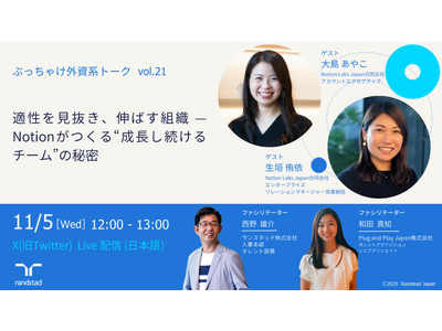 総合人材サービスを提供するランスタッド株式会社(本社:東京都千代田区 代表取締役会長兼CEO 道上 淳之介、代表取締役社長 猿谷哲)は、2025年11月5日(水)12時より、ソーシャルメディアX(旧Twitter)スペースにて、ライブ配信イベント「ぶっちゃけ外資系トーク」の第21回目を配信いたします。今回は、Notion Labs Japan合同会社より、エンタープライズ リレーションマネージャー営業統括の生垣 侑依氏と、アカウントエグゼクティブの大島あやこ氏をゲストにお迎えします。