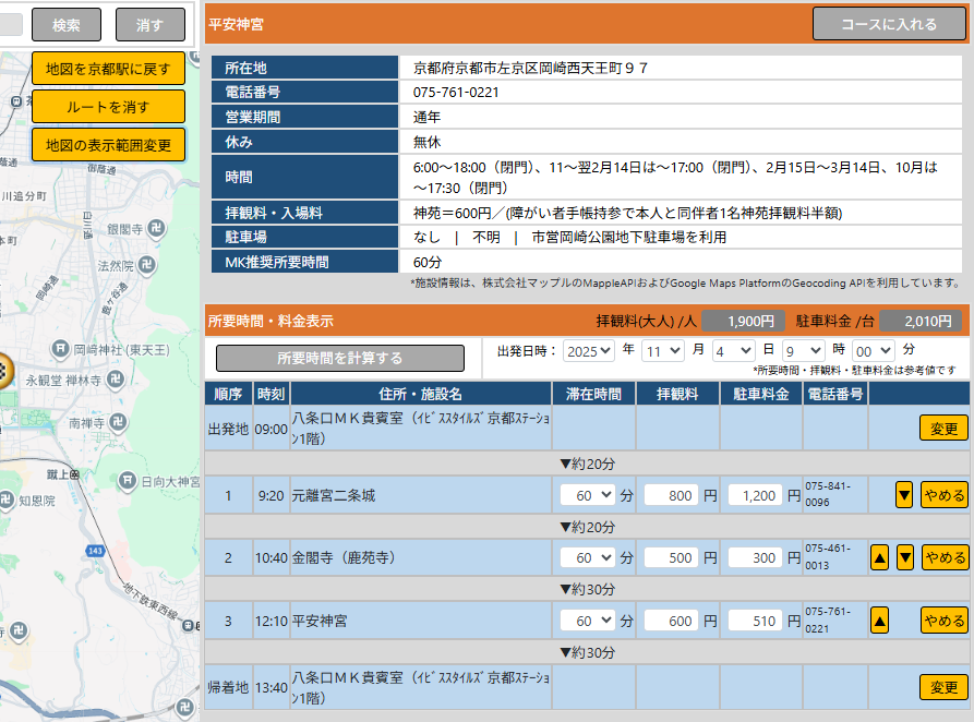 「京たびプランナー by MKタクシー」は操作性がシンプルで直感的なWEB操作でコース作成ができることが特徴です。「施設名検索」に観光スポット名を入力して検索すればその観光スポットの情報が表示されますので、「コースに入れる」ボタンをクリックすれば地図画面にマッピングされ行程表に組み込まれます。検索窓の下にある「神社仏閣」などのボタンをクリックすれば地図上に各スポットのアイコンが現れてアイコンをクリックすれば施設情報が閲覧できます。次の訪問地を検索してコースに入れるのを繰り返し、最後に「所要時間を計算する」ボタンをクリックすれば移動時間を含めた全行程の時間が示されます。コース作成が出来ればそのまま予約することも可能です。