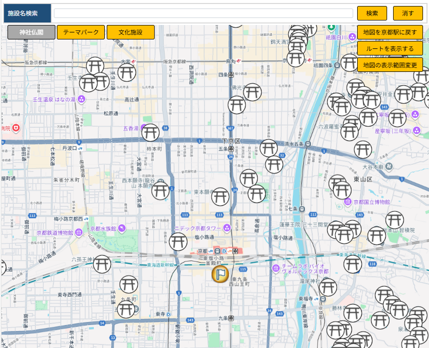 検索窓の下にある「神社仏閣」ボタンでアイコンが出現。
