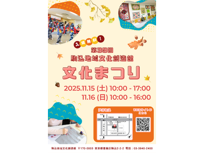 公益財団法人としま未来文化財団(所在地:東京都豊島区、理事長:合場直人)は、駒込地域文化創造館(豊島区駒込2-2-2)にて、館最大の文化イベント「第39回 駒込地域文化創造館文化まつり」を、11月15日(土)・16日(日)の2日間にわたり開催いたします。