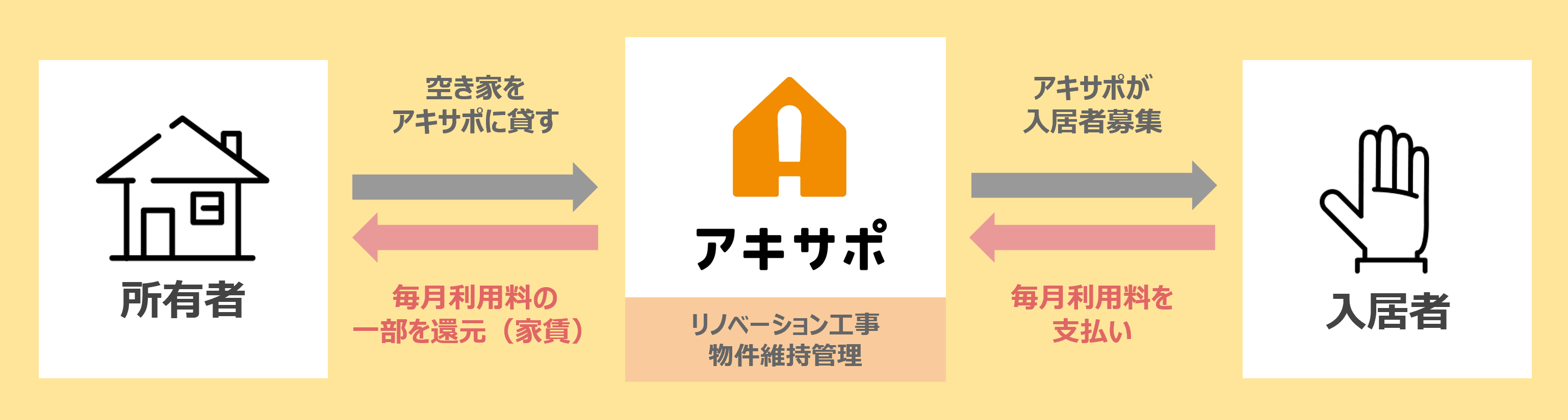 「アキサポ」が空き家を借り受け、「アキサポ」の基本費用負担でリノベーション工事を行い、一定期間転貸するサービスです。地域にマッチした空き家活用を提案し、街の資源である空き家の再生を通じて地域コミュニティの活性化に貢献しております。