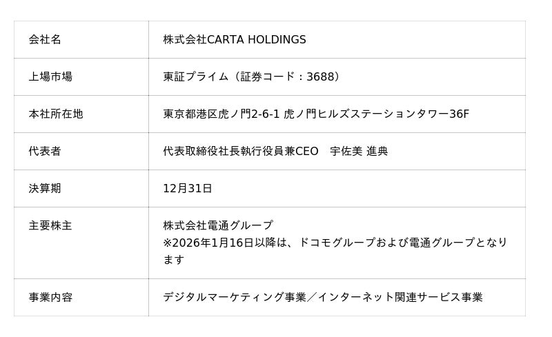 株式会社CARTA HOLDINGS(東京都港区、代表取締役社長執行役員兼CEO:宇佐美 進典、東証プライム市場:証券コード3688、以下「CARTA HD」)は、プロダクション事業のさらなる拡大とガバナンス体制の強化を目的として、2025年11月4日付で新会社「株式会社CARTA ENTERTAINMENT」(以下、「CARTA ENTERTAINMENT」)を設立することをお知らせいたします。